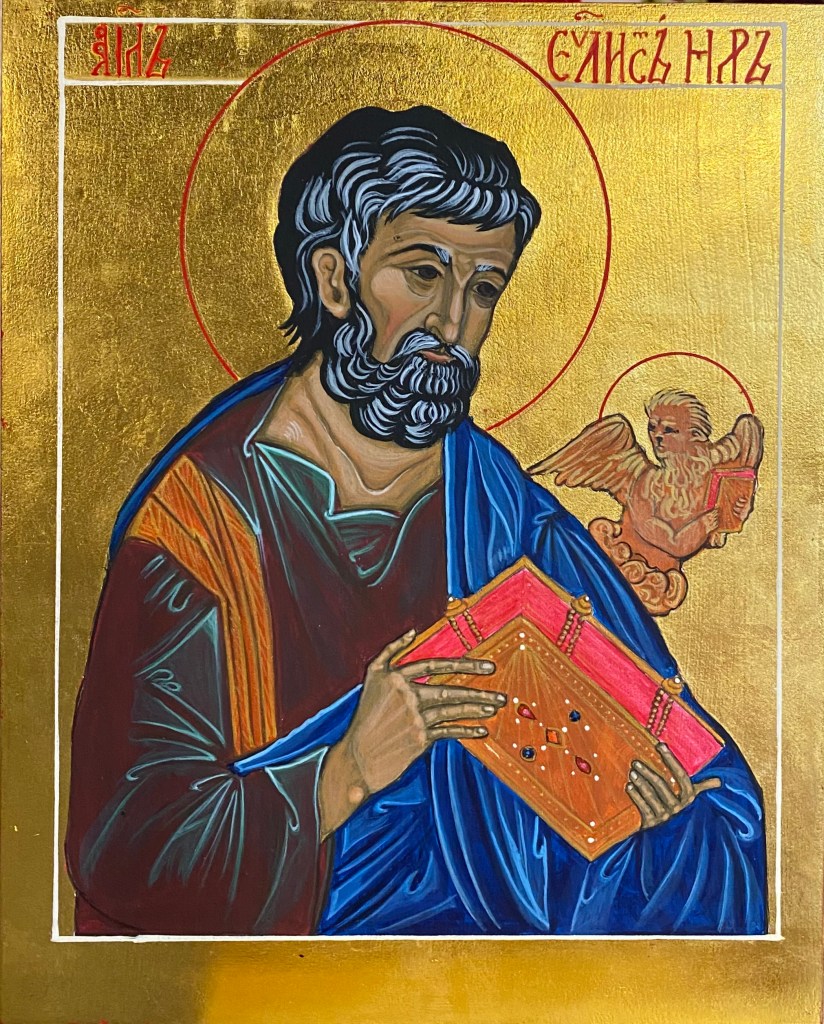 Here’s an icon of St. Mark, the Evangelist. There are traditional symbols for the evangelists, and St. Mark’s is the lion. You see that lion alongside of the saint, also holding the Gospel.